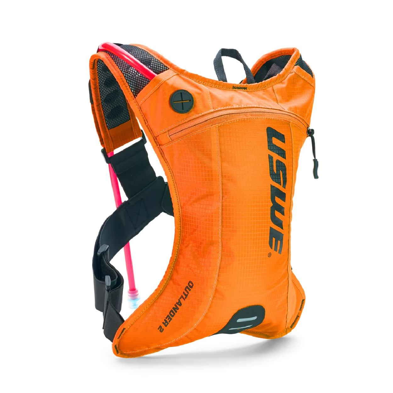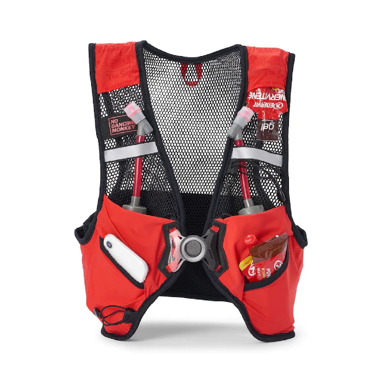 Chaleco de hidratación con compartimientos y reflectores.